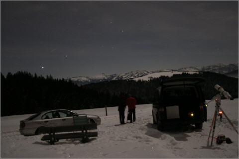 Um dem fetten Hochnebel bei uns zu entgehen, war wieder einmal der Pfänder fällig. Ein kurzer Anruf bei Manfred und Erich, das Auto geladen und pünktlich um 16:00 Uhr ging es dann los. Nach der problemlosen Anfahrt konnten wir noch im Hellen aufbauen. Eigentlich wollte ich den Gaul aufs Korn nehmen, ich konnte mich aber dann dazu durchringen, den Mond zu beobachten. Um 19:44 Uhr konnten Erich und ich eine grünliche Feuerkugel beobachten, die fast senkrecht im Westen herunter kam. |